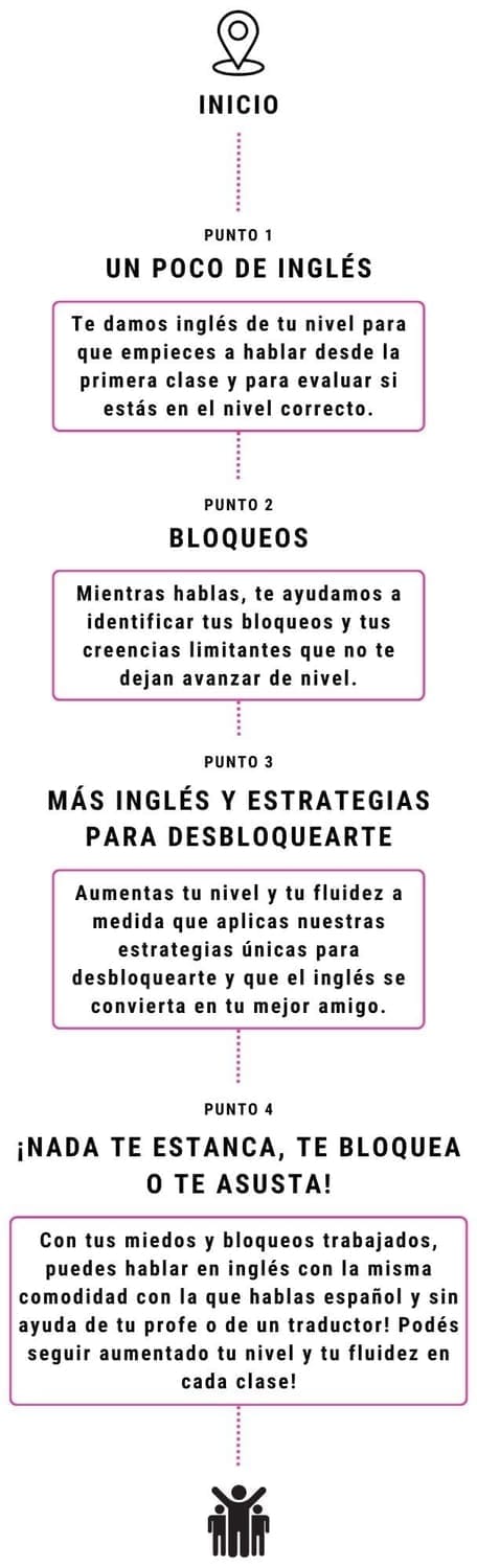Sin sorpresas:A. Mirás los videos de la semana (1hs)B. En los primeros minutos de cada clase, resolvés dudas sobre los videos y tu profe te da las actividades orales para practicar los temas de los videos.C. En pares, completás las actividades orales hablando en inglés por 40 minutos con un compañer@ con tu nivel mientras tu profe de ayuda y te corrige.D. En los últimos 5 minutos, tu profe da devoluciones grupales e individuales.Cada clase es como juntarse a tomar un café con un amigo a tomar un café y hablar el inglés que te enseñamos.